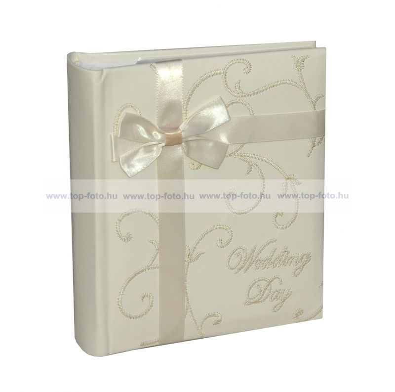 Esküvői fényképalbumLapok színe: fehér papírA fedél típusa / kialakítása: műbőr + selyemTípusa: bedugós, könyvkötéssel varrott oldalakBerakható képek száma: 50 db 13x18 cm méretű fénykép.
