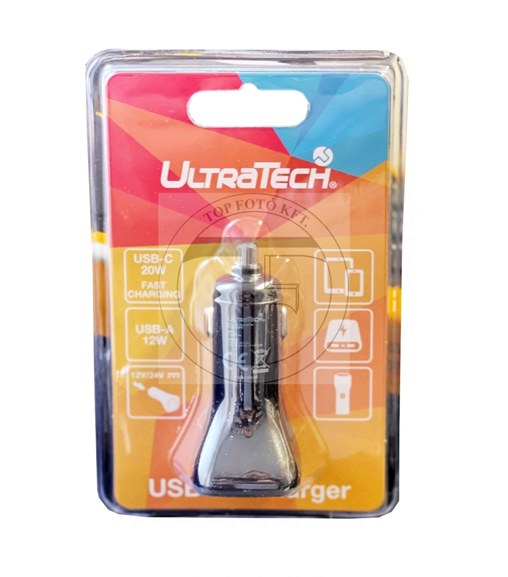 UltraTech Autoladegerät 1xUSB-A (20W), 1xUSB-C (12W) 12-24V DC Schnellladegerät